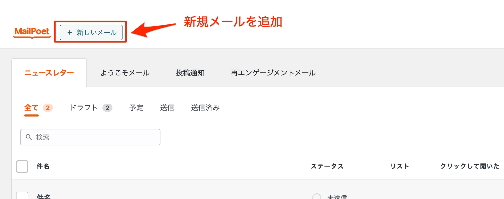 配信するメールを作成するには、運営管理画面から【メルマガ管理】>【メール】>【新しいメール】をクリックするとメールの作成(雛形の選択)ページが開きます。